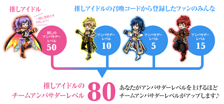 各アイドルごとにチームアンバサダーレベルによりランキングが出ます。アンバサダーレベルは友だちをアンバサダーに招待したり、「#黒騎士と白の魔王」をつけてTwitterでつぶやくことであがります。さらにアイドル本人のアンバサダーレベルは3倍として加算!